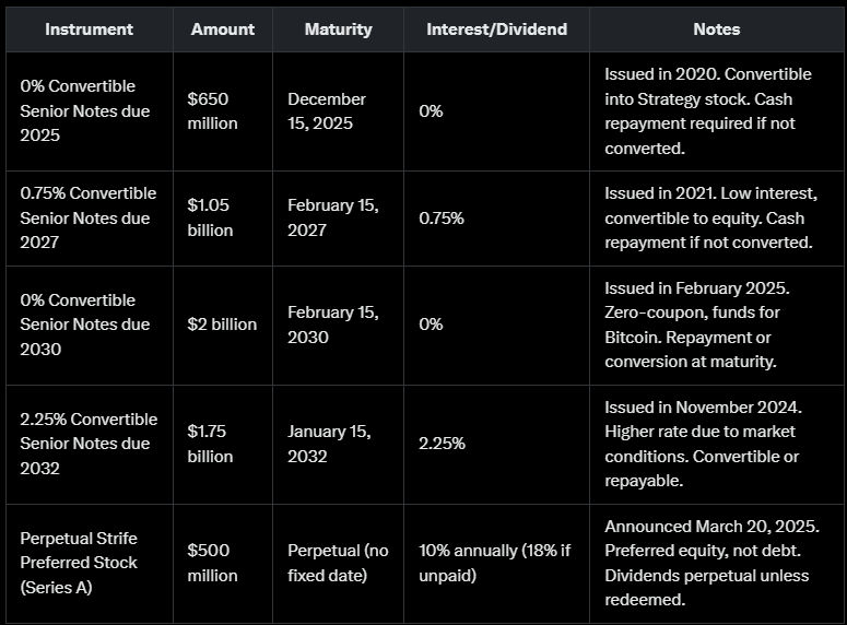 As of late 2024, Strategy’s total liabilities are around $4.57 billion, majorly tied to convertible notes. With an additional $2 billion from 2030 notes and $500 million from preferred stock issued in 2025, the company’s total debt burden is well over $7 billion. These obligations carry specific maturity dates, at which point Strategy must either repay the principal or convert the debt into equity.